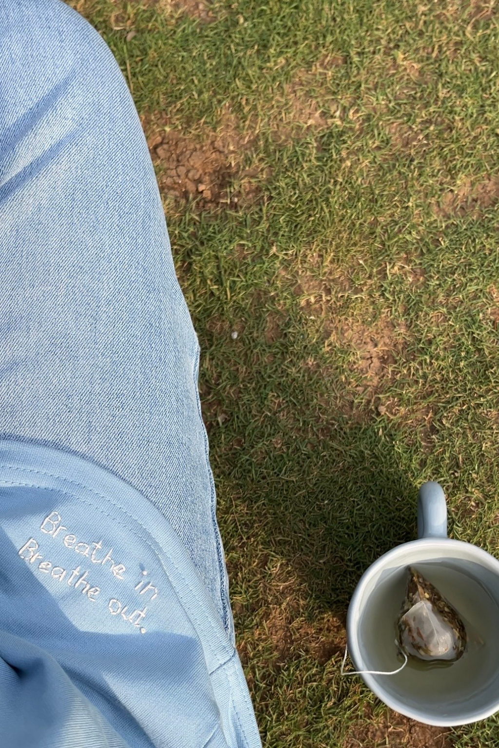 It's hand-embroidered on the back — a gentle nudge for the days when you forget to believe in good outcomes.